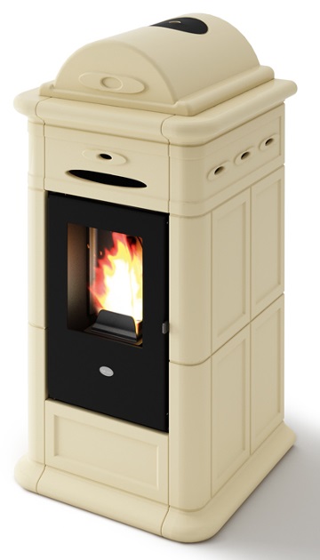 Teplovzdušná peletová kamna Adele mají majolikový obklad, zásobník na pelety o velikosti 18,5 kg, 5 úrovní provozního výkonu, odnímatelný popelník, menu v 6 jazycích, bezpečnostní termostat a možnost dálkového ovládání.